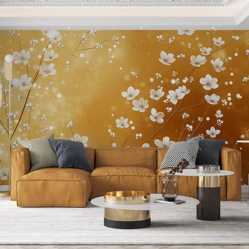 WonderMuralA Mural Wallpaperunk egy bőséges motívumot mutat be, amelyen fehér virágok finoman vannak ábrázolva, arany színekkel körülvéve, amelyek egy kis csi...