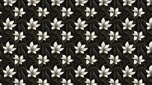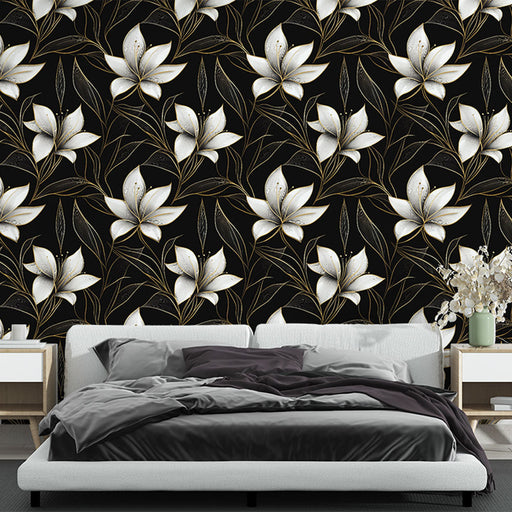 WonderMuralFedezze fel Tapete termékeinket, amelyek gyönyörű mintázatot mutatnak be elegánsan rajzolt fehér virágokkal egy mély fekete háttéren, finom arany r...