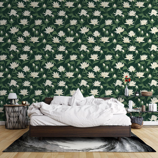 WonderMuralEz a tapéta egy gyönyörű mintázatot mutat be, amelyen fehér vízililiomok finoman lebegnek egy sötétzöld hátteren. A finom virágok és gazdag levelek...