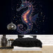 Ez a lenyűgöző falfestmény tapéta egy stilizált csikóhalat ábrázol finom vonalakkal, amelyet sokszínű árnyalatok világítanak meg egy mély fekete háttéren. A kifinomult részletek és az élénk színű pontok varázslatos és mesebeli hangulatot teremtenek, egyedi megjelenést kölcsönözve belső tereinek.