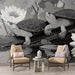 Ez a tapéta egy lenyűgöző design-t hangsúlyoz, amely finoman rajzolt béka-kat mutat, amint egy lebegő tuskón pihennek a pompás vízililiomok mellett. A finom vonalak és a monokróm illusztráció művészi és kortárs dimenziót adnak a térnek.