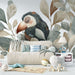 Ez a tapéta nyugalmat idéz elő a bájos trópusi madár motívumával, egy békés tukán, amely finoman illusztrált levelek között pihen. A zöld, bézs és kék lágy árnyalatai pihentető légkört teremtenek, ideálisak arra, hogy egy kis természetet vigyenek az otthonába.