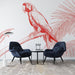 Exkluzív fotó tapéta mutat egy művészi ábrázolás egy vibráló, stilizált piros papagáj ül egy ágon, körülvéve finom pálma levelek. A vonalak finomsága életre kelti ezt a tervezést, miközben elegáns és dinamikus érintést ad a térnek.