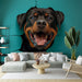 Ez a 3D Rottweiler tapéta úgy tűnik, mintha egy türkiz színű falból törne elő. Fekete és barna bundájának élethű részletei és barátságos kifejezése élénk és merész karaktert kölcsönöz bármelyik szobának.