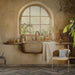 Ez a rusztikus hangulatú tapéta megragadja egy vintage belső tér melegségét, tökéletes arra, hogy egy kis bájt vigyen otthonába. A kép egy régi stílusú mosdót mutat üveg kiegészítőkkel és fa ablakkerettel, zöld növényekkel és fonott kosarakkal körülvéve. Egy macska pihen egy fém széken, egy természetes fényben fürdő környezetben, amely ideális egy barátságos és nyugodt légkör megteremtéséhez bármelyik szobában.