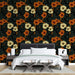 Prémium Tapetánk merész mintával van díszítve, narancssárga és krém színű virágokkal, amelyek kiemelkednek a mély fekete háttér előtt. Minden virág élénk árnyalata melegséget és dinamikus energiát hoz, így ez a design bármely szoba központi eleme lehet.