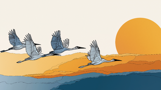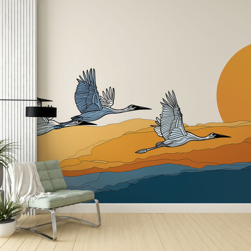 WonderMuralLa nostra superba carta da parati murale presenta un motivo grafico di aironi volanti su uno sfondo con tonalità calde di arancione e blu. La combi...