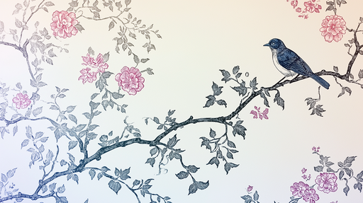 WonderMuralQuesta carta da parati shabby chic presenta un affascinante uccello delicatamente illustrato, posato su un ramo adornato con rose rosa. Lo sfondo m...