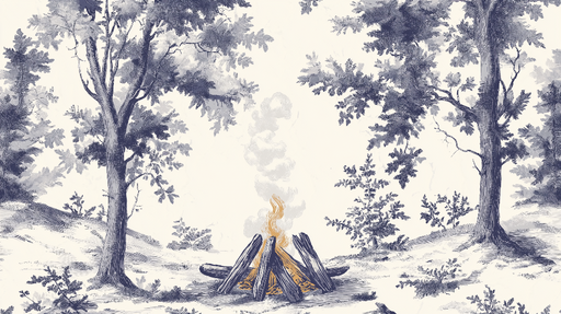 WonderMuralLa nostra carta da parati murale shabby chic cattura la serenità di un paesaggio forestale con un confortante falò, circondato da alberi maestosi. ...