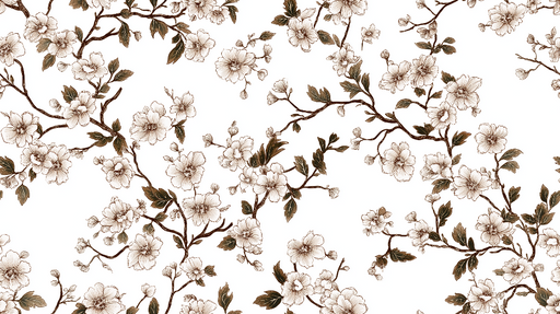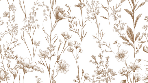 WonderMuralQuesta carta da parati shabby chic presenta un elegante motivo di fiori e rami stilizzati, illustrati in tonalità tenui di marrone su sfondo bianco...