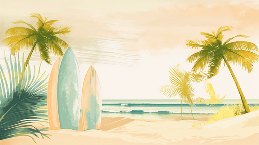 WonderMuralLa nostra carta da parati evoca un sereno paesaggio spiaggia, dove le tavole da surf color pastello si ergono su una morbida sabbia dorata. Le palm...