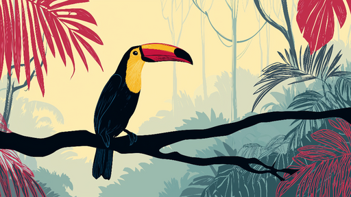 Visualizza tutti i dettagliCarta da parati toucan | Un colorato toucan posato in una giungla stilizzata
