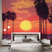 Questa carta da parati evoca un tramonto mozzafiato su una spiaggia, accentuato dalle silhouette delle palme che danzano nel vento. Le calde sfumature di rosa, arancione e giallo si fondono per creare un'atmosfera rilassante, perfetta per uno spazio di ritiro. L'orizzonte si estende maestosamente con riflessi scintillanti sulle onde, portando un senso di serenità e tranquillità.
