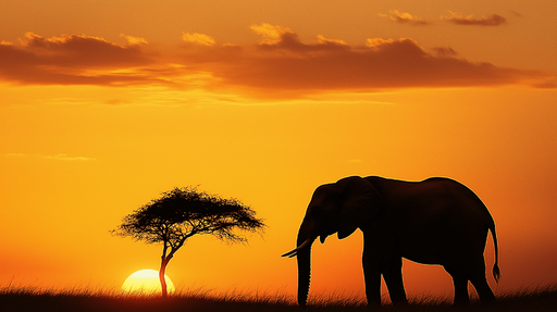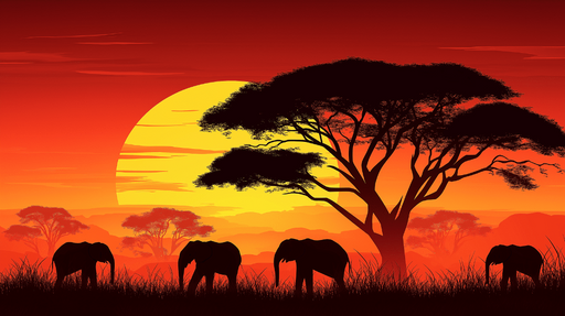 WonderMuralQuesta affascinante carta da parati murale raffigura la silhouette maestosa di un elefante che prende vita sotto un tramonto spettacolare. Le tonal...