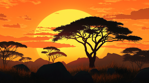 WonderMuralQuesta carta da parati murale presenta una magnifica illustrazione di un tramonto africano, mettendo in risalto le silhouette degli acacie. Le viva...