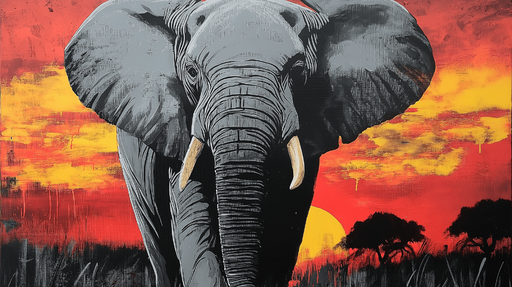WonderMuralQuesto affascinante quadro raffigura un maestoso elefante che si erge fiero di fronte a un tramonto infuocato, creando un'atmosfera sia potente che...