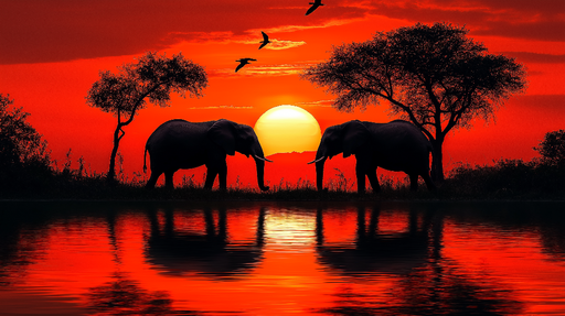 WonderMuralQuesta affascinante carta da parati murale presenta una magnifica scena di silhouette di elefanti vicino all'acqua, avvolti nei colori caldi di un ...