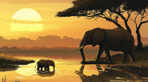 WonderMuralQuesta carta da parati murale offre una magnifica scena di un tramonto con maestosi elefanti che si trovano vicino a un corpo d'acqua. Le tonalità ...
