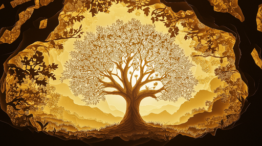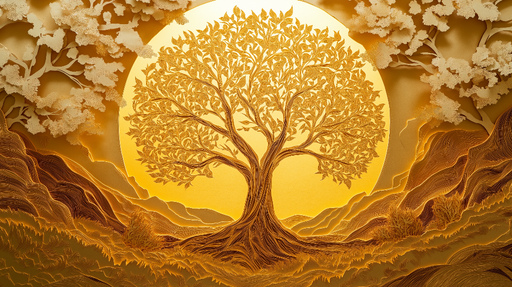 Visualizza tutti i dettagliCarta da parati albero dorato | Albero maestoso circondato da un paesaggio luminoso