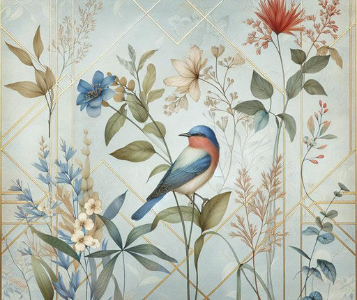 Visualizza tutti i dettagliCarta da parati Art Deco | Uccello e fiori su sfondo blu con accenti dorati