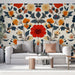 Questa carta da parati murale presenta un magnifico motivo floreale, ricco di colori, con fiori in tonalità vibranti di arancione, rosso e blu. I dettagli artistici danno vita ad ogni fiore, creando un'atmosfera calda e accogliente nel tuo interno.