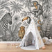 Questa carta da parati rappresenta una vivace scena della giungla, con animali esotici come una zebra, scimmie e un tucano. I dettagli raffinati sono accentuati da uno sfondo di lussureggiante vegetazione che crea un'atmosfera vivace e tropicale.