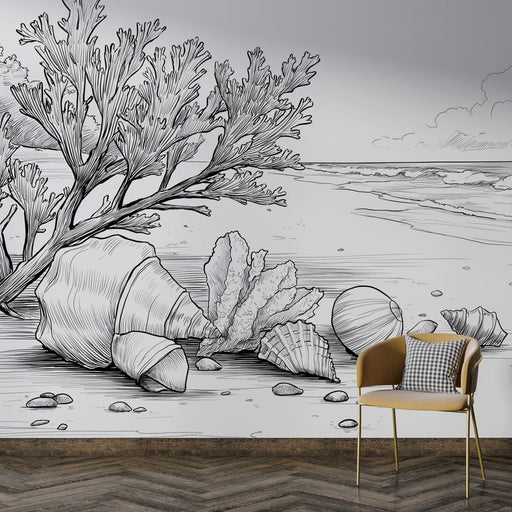 WonderMuralQuesta carta da parati murale rappresenta una affascinante scena di spiaggia, mostrando delicate conchiglie e alghe disegnate con precisione, crean...