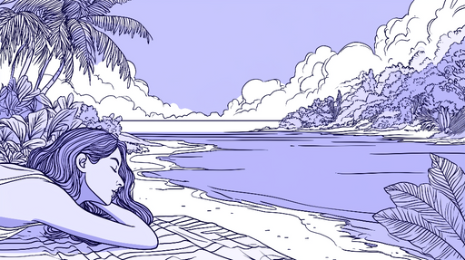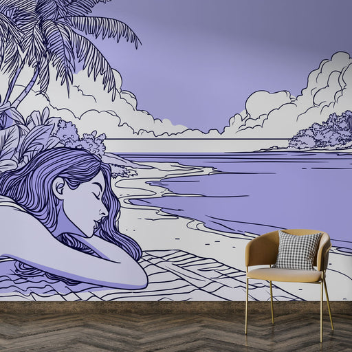 WonderMuralQuesta carta da parati illustra una bellissima scena di spiaggia in cui un personaggio si rilassa su una sdraio, contemplando un cielo blu punteggi...