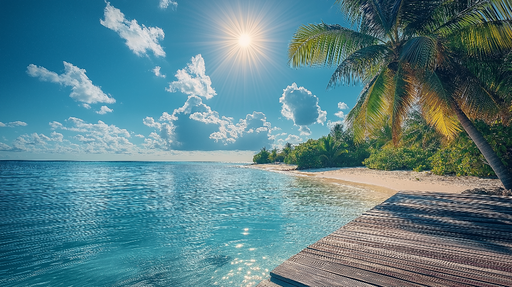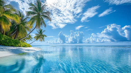 WonderMuralQuesta magnifica illustrazione di una spiaggia tropicale evoca evasione e serenità. Il cielo azzurro, punteggiato di nuvole soffici, si riflette ne...