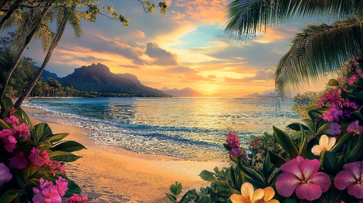 Visualizza tutti i dettagliCarta da parati spiaggia tropicale | Tramonto incantevole con fiori colorati