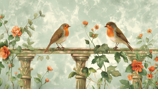 WonderMuralQuesta affascinante carta da parati murale presenta due affascinanti pettirossi appollaiati su una classica balaustra circondata da rose in fiore. ...