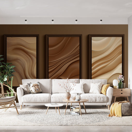 WonderMuralQuesta carta da parati presenta una composizione affascinante di onde astratte in tonalità di marroni e beige. Le linee fluide e le texture delicat...