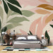 Questa carta da parati murale presenta grandi foglie stilizzate in tonalità di verde scuro, rosa cipria e beige, creando un'atmosfera morbida e naturale. Le forme vegetali si sovrappongono armoniosamente su uno sfondo chiaro, dando un effetto di leggerezza ed eleganza all'intero ambiente. Il motivo, sia moderno che rilassante, porta un tocco di freschezza alle tue pareti.