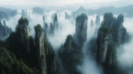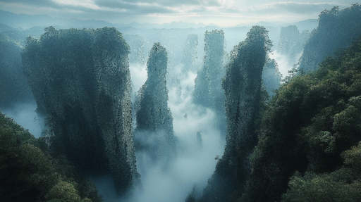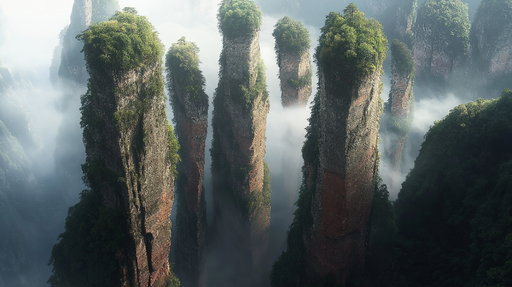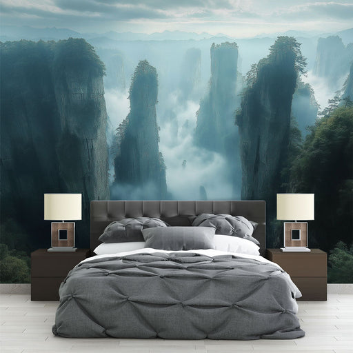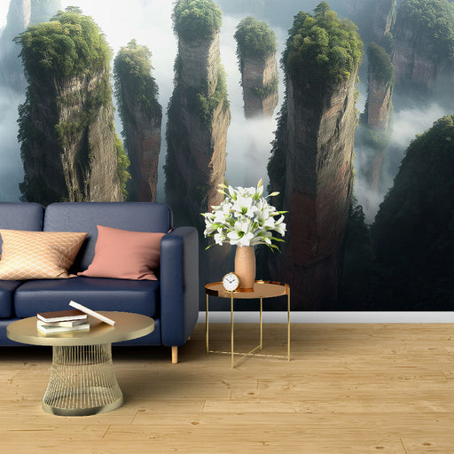 Visualizza tutti i dettagliCarta da parati montagne mistiche | Pilastri di roccia circondati da nebbia e vegetazione