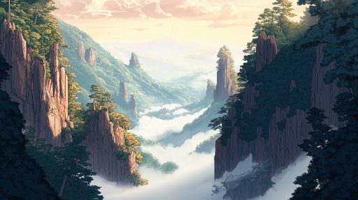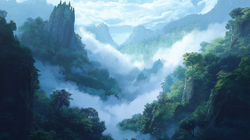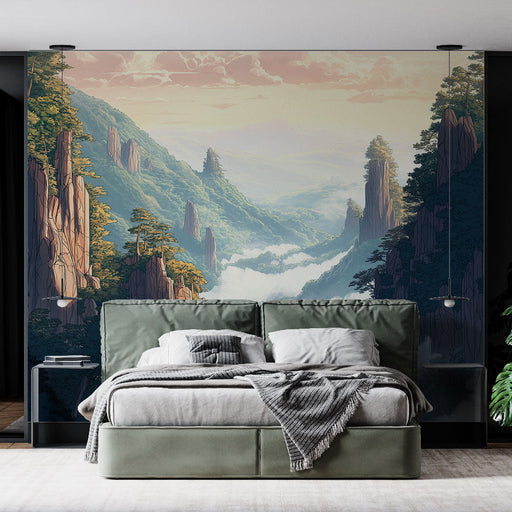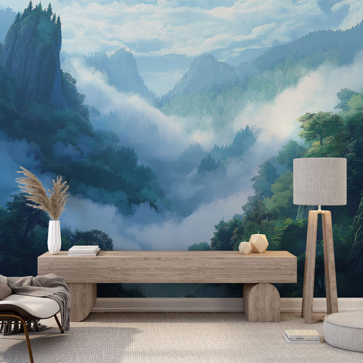 WonderMuralQuesta splendida carta da parati murale presenta un maestoso paesaggio montano, con ripide vette delicatamente avvolte nella nebbia. I verdi vibran...