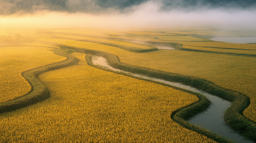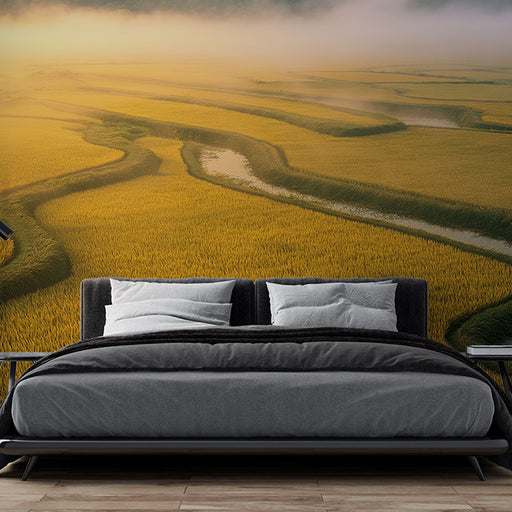 Visualizza tutti i dettagliCarta da parati paesaggi di campi di riso | Bagliore dorato nella nebbia del mattino