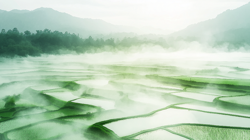 WonderMuralQuesta carta da parati murale evoca tranquillità con un motivo di rigogliosi campi di riso avvolti nella nebbia, catturando la serena bellezza dell...