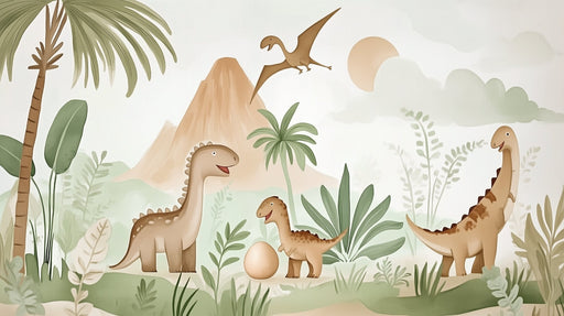 WonderMuralIl nostro wallpaper rappresenta un incantevole motivo di dolci dinosauri, ideale per le camere dei bambini o spazi giochi. I colori pastello beige ...