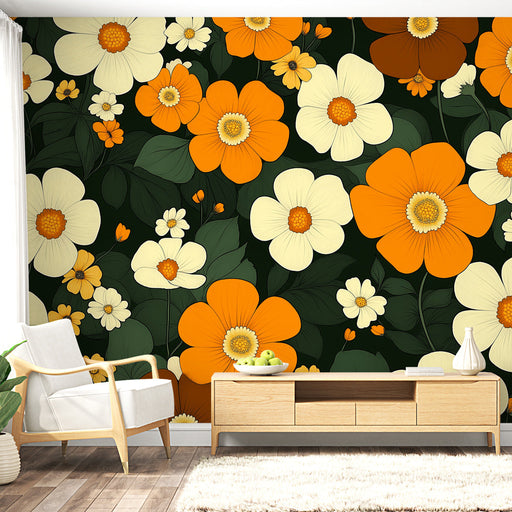 Visualizza tutti i dettagliCarta da parati con fiori arancioni e bianchi | Motivo floreale con tocchi arancioni vibranti