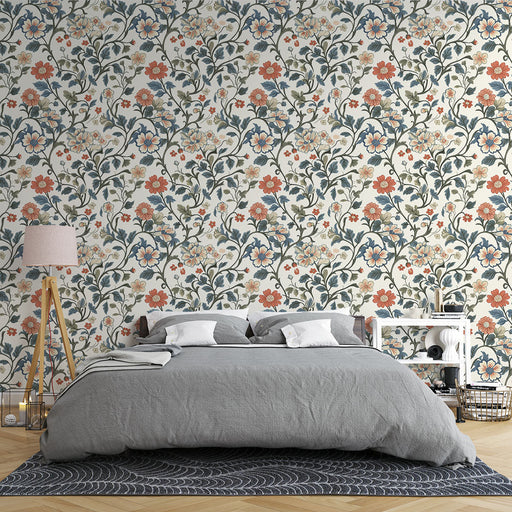 WonderMuralQuesta carta da parati murale floreale presenta un bellissimo pattern di fiori luminosi e foglie eleganti, mescolando tonalità di rosso, blu e beig...