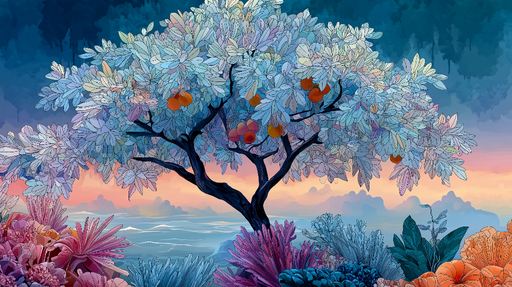 Visualizza tutti i dettagliCarta da parati albero da frutto | Albero con foglie argentate e frutti in un paesaggio fantastico