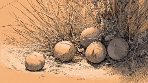 WonderMuralQuesto murale cattura una scena pacifica di frutta stilizzata circondata da una vegetazione lussureggiante. Le tonalità del beige e dell'arancione ...