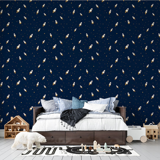 WonderMuralLa nostra bellissima carta da parati murale mostra razzi illustrati bianchi con dettagli dorati, fluttuando in mezzo a un cielo blu notte dissemina...