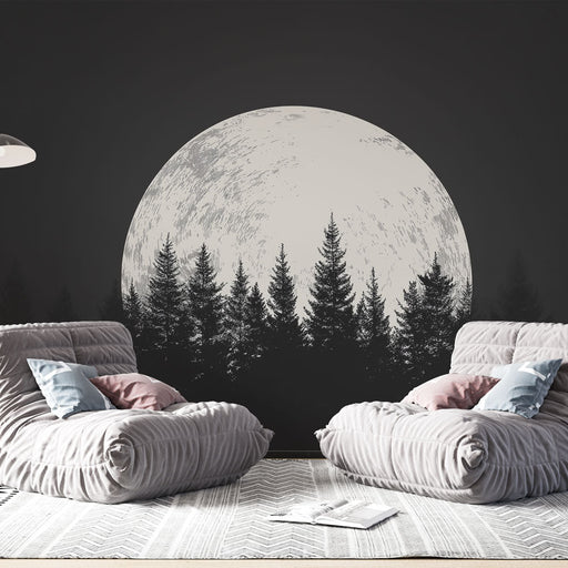 WonderMuralIl nostro esclusivo Carta da parati murale mostra una grande luna piena illuminata su uno sfondo di silhouette di alberi scuri, creando un'atmosfer...