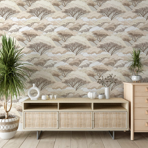 Visualizza tutti i dettagliCarta da parati per la foresta dolce | Alberi dettagliati in tonalità neutre e rilassanti
