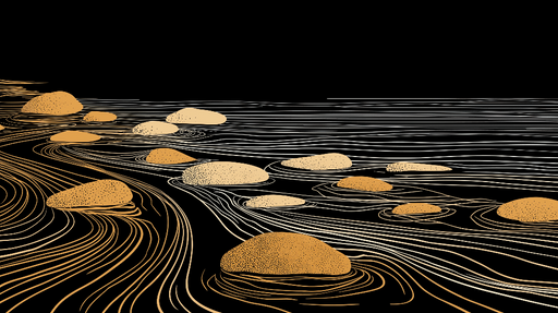 WonderMuralLa nostra superba carta da parati murale presenta un elegante motivo di sassi dorati che emergono da uno sfondo nero, accompagnati da delicate line...