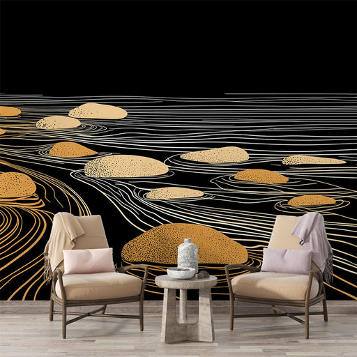 Visualizza tutti i dettagliCarta da parati galets | Motivo moderno di ciottoli dorati su sfondo nero con linee fluide