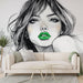 Questa Carta da parati murale presenta un affascinante disegno di un volto femminile, evidenziando labbra verdi brillanti che aggiungono un tocco audace e moderno. Lo stile in bianco e nero del ritratto accentuato da dettagli verdi crea un sorprendente effetto visivo, ideale per una decorazione contemporanea o artistica.