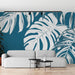 Carta da parati blu teal | Foglie tropicali bianche su uno sfondo blu intenso