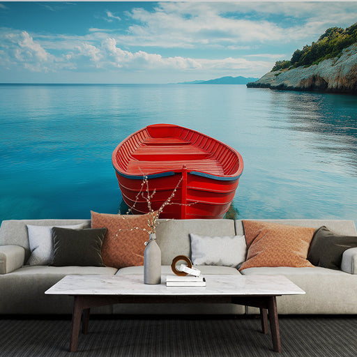 Scopri la nostra carta da parati murale con un design marino, che presenta barche, palme e paesaggi costieri stilizzati. Colori caldi come l'arancione tenue e il nero contrastano elegantemente con uno sfondo color crema, creando un'atmosfera sia vibrante che rilassante.